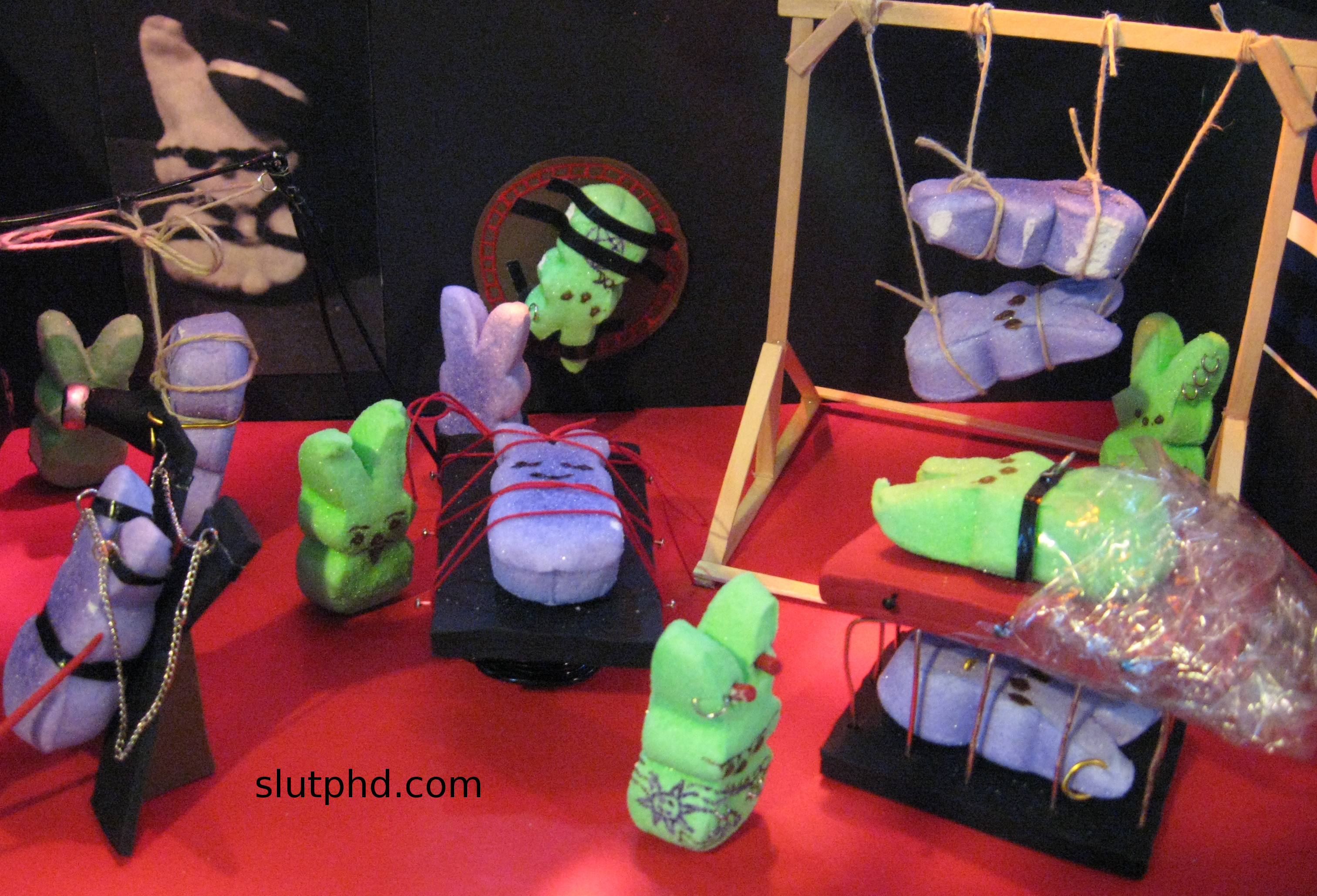 My husband and I made this a crazy labor of love awhile back. There’s a St. Andrew’s Cross, a bondage table, a metal suspension rig with a peep in a gas mask, a bondage wheel, a wooden suspension rig, a metal cage, and a peep in saran wrap bondage. I made silly peep pin-up pics and a leather daddy peep for the background just to add color. This was definitely the most entertaining arts and crafts project I’ve ever done. Even more fun than the threesome barbies.