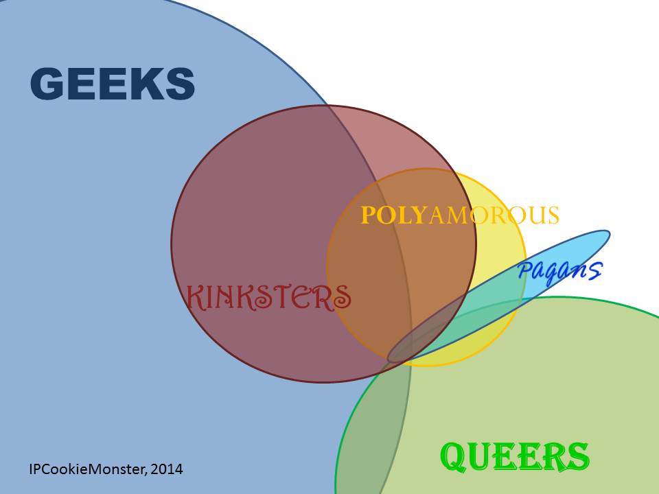 People who participate in the public BDSM scene tend to participate in a lot of overlapping and adjacent subcultures as well, most notably the geek subculture, the pagan subculture, and the polyamorous subculture. Polyamory??? You know, that crazy thing where people get to sleep with people who aren’t their spouses, but don’t lie about it… or have meaningful relationships with lots of people… or some combination of the above.